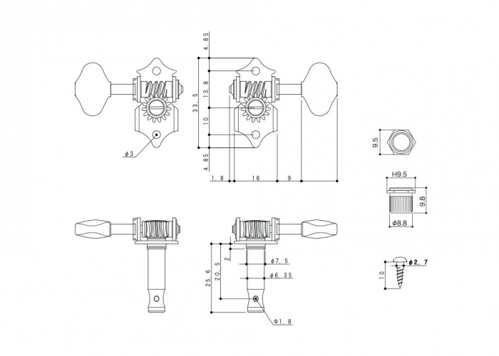 3 per side Gotoh® SE700 vintage style open gear tuning machines with 8.8mm press-fit bushings. Nickel with plastic keystone buttons. (set of 6 keys = 3 right + 3 Left)
